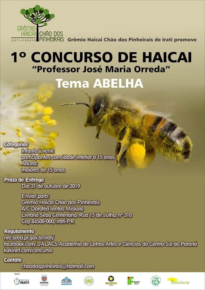 O Grêmio Haicai Chão dos Pinheirais, de Irati-PR em parceria com o Núcleo Regional de Educação de Irati, tem a honra de divulgar o 1º Concurso de Haicai" Professor José Maria Orreda", com o tema "Abelha", nas categorias infantojuvenil e adulto.